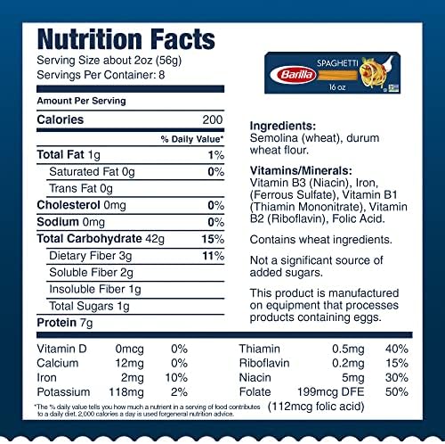 Barilla Spaghetti Pasta, 16 oz. Box - Amazon.com BARILLA PASTA: Long, golden strands of pasta made with 100% durum wheat and water to deliver great taste and "al dente" texture every time ... We recommend that you do not solely rely on the information presented and that you always read labels, warnings, and directions before using or consuming a product. For additional information about a ...