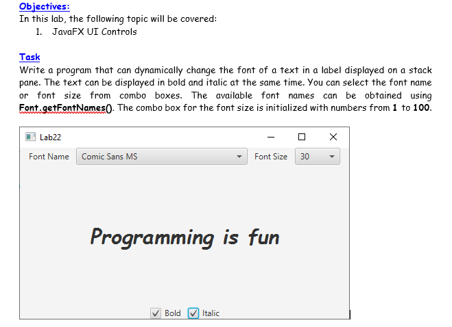 Working With Layouts in JavaFX - Oracle Each layout pane has its own rules for allocating space according to the minimum, preferred, and maximum size ranges of the controls.In general, controls that have a default maximum size of Double.MAX_VALUE expand to fill their space while controls with constrained maximum sizes do not expand. JavaFX changing a labels size - Stack Overflow 1 Something like this will change the size of the label without changing the size of the text: Label label = new Label ("This is a label"); label.setMinWidth (50); label.setMinHeight (50); To change the text/font you could use Font class or font method. Share Improve this answer Follow edited Nov 3, 2017 at 15:21 Neuron 4,957 5 37 56 JavaFX | Label - GeeksforGeeks Label is a part of JavaFX package . Label is used to display a short text or an image, it is a non-editable text control. It is useful for displaying text that is required to fit within a specific space, and thus may need to use an ellipsis or truncation to size the string to fit.