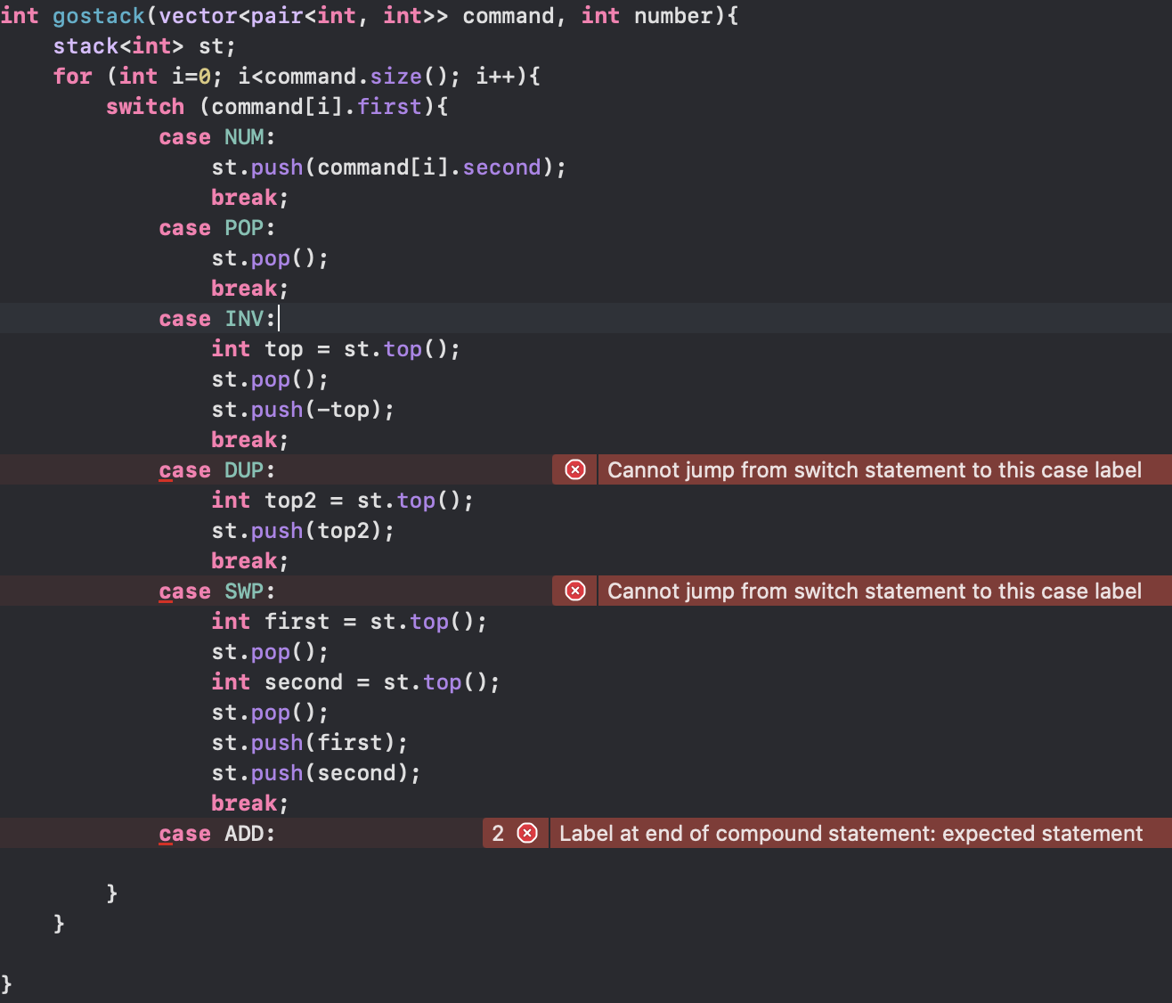Compiler Error C2360 | Microsoft Learn Aug 2, 2021 · The initialization of identifier can be skipped in a switch statement. You cannot jump past a declaration with an initializer unless the declaration is enclosed in a block. (Unless it is declared within a block, the variable is within scope until the end of the switch statement.) The following sample generates C2360: C++ c++ - initialization of 'element' is skipped by 'case' label ... When a variable is declared in one case, the next case is technically still in the same scope so you could reference it there but if you hit that case without hitting this one first you would end up calling an uninitialised variable. This error prevents that.